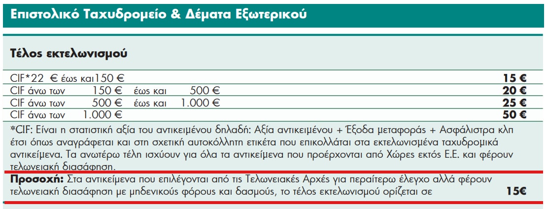 Προσοχή: Στα αντικείμενα που επιλέγονται από τις Τελωνειακές Αρχές για περαιτέρω έλεγχο αλλά φέρουν τελωνειακή διασάφηση με μηδενικούς φόρους και δασμούς, το τέλος εκτελωνισμού ορίζεται σε 15€