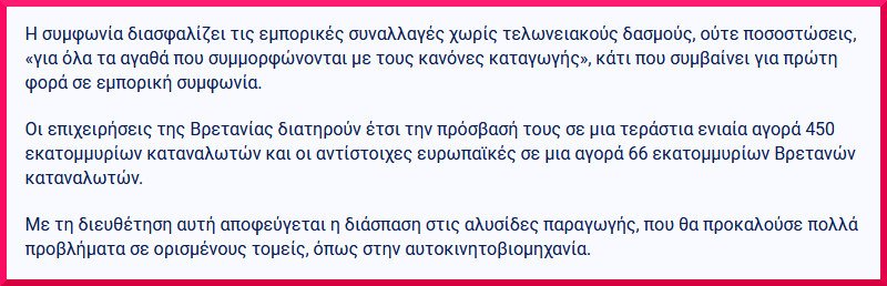 Κοινός, η Αγγλία θα φύγει από την Ευρωπαϊκή Ένωση, αλλά για το εμπόριο θα είναι σαν να μην έφυγε ποτέ. Ουσιαστικά γίνεται η πρώτη χώρα εκτός Ευρωπαϊκής ένωσης που τα αντικείμενα δεν θα περνάνε τελωνείο.